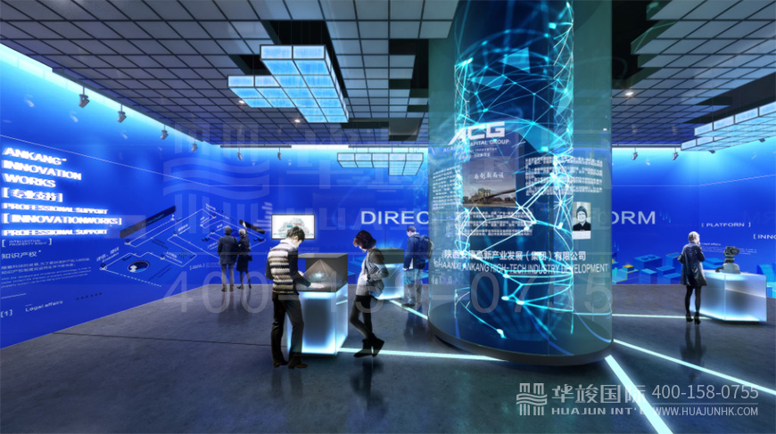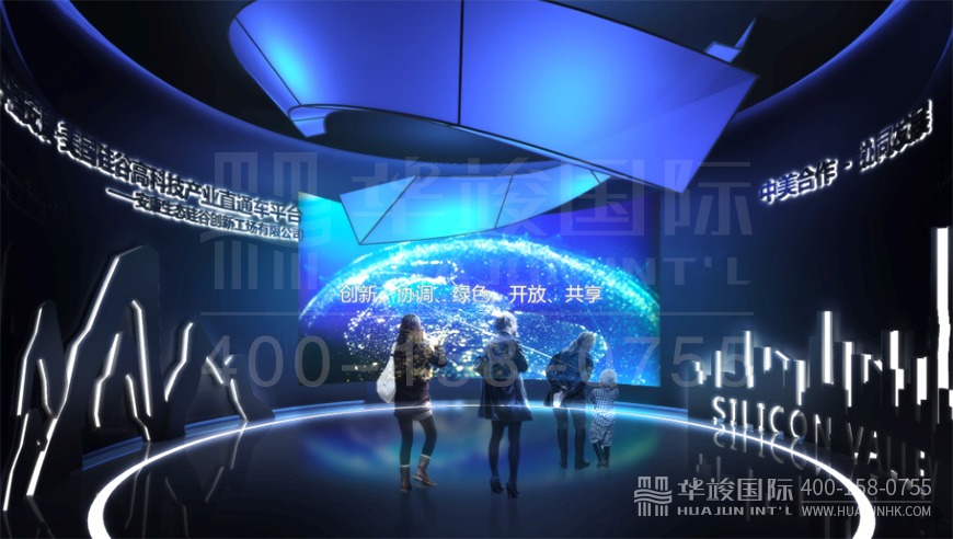 安康生態硅谷創新工場展廳設計項目由華竣國際執行整體設計施工,華竣國際以創新的智慧展廳設計理念,融合互聯網+思維,順應科技化趨勢,結合互動多媒體、數字影片、數字沙盤、虛擬現實等科技展項,打造震撼視覺的高品質科技展廳。